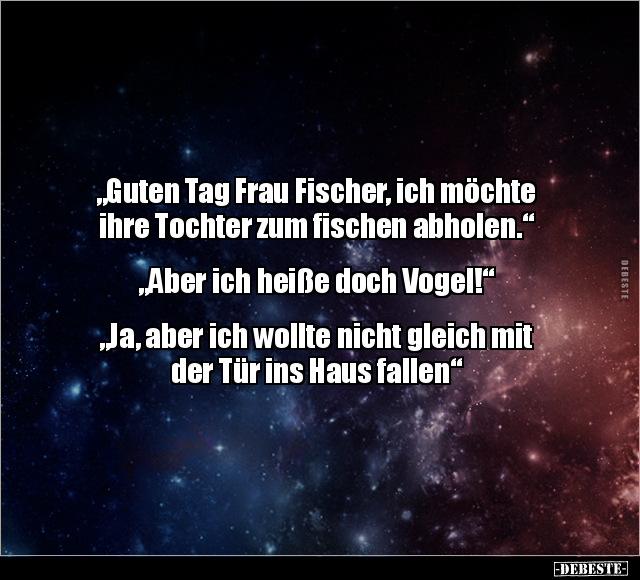 „Guten Tag Frau Fischer, ich möchte ihre Tochter zum fischen abholen.“ „Aber ich heiße doch Vogel!“ „Ja, aber ich wollte nicht gleich mit der Tür ins Haus fallen“