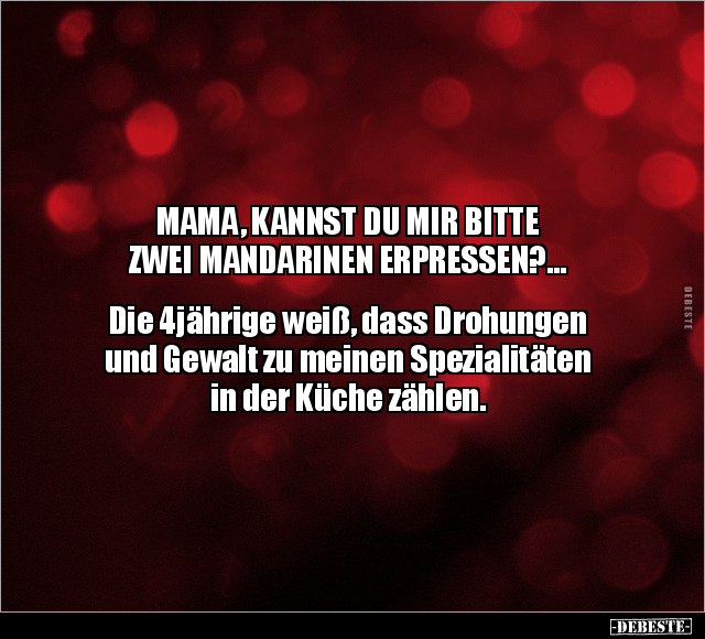 MAMA, KANNST DU MIR BITTE ZWEI MANDARINEN ERPRESSEN?... Die 4jährige weiß, dass Drohungen und Gewalt zu meinen Spezialitäten in der Küche zählen.