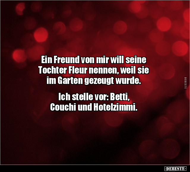 Ein Freund von mir will seine Tochter Fleur nennen, weil sie im Garten gezeugt wurde. Ich stelle vor: Betti, Couchi und Hotelzimmi.