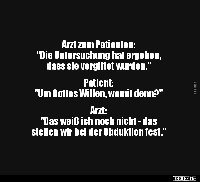 Arzt zum Patienten: "Die Untersuchung hat ergeben, dass sie vergiftet wurden." Patient: "Um Gottes Willen, womit denn?" Arzt: "Das weiß ich noch nicht - das stellen wir bei der Obduktion fest."