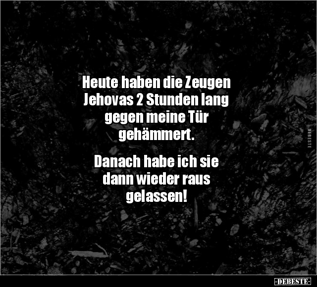 Heute haben die Zeugen Jehovas 2 Stunden lang gegen meine Tür gehämmert. Danach habe ich sie dann wieder raus gelassen!