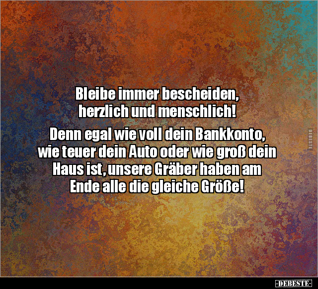 Bleibe immer bescheiden, herzlich und menschlich! Denn egal wie voll dein Bankkonto, wie teuer dein Auto oder wie groß dein Haus ist, unsere Gräber haben am Ende alle die gleiche Größe!