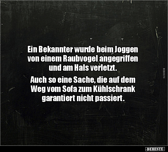 Ein Bekannter wurde beim Joggen von einem Raubvogel angegriffen und am Hals verletzt. Auch so eine Sache, die auf dem Weg vom Sofa zum Kühlschrank garantiert nicht passiert.