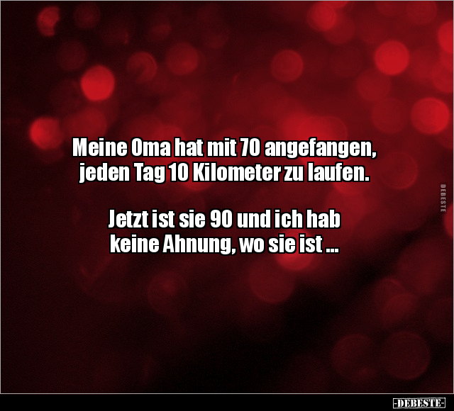 Meine Oma hat mit 70 angefangen, jeden Tag 10 Kilometer zu laufen. Jetzt ist sie 90 und ich hab keine Ahnung, wo sie ist ...