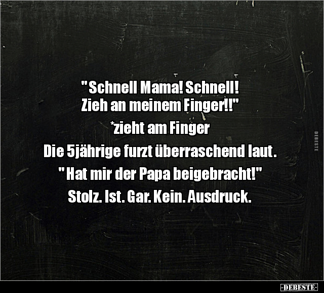 " Schnell Mama! Schnell! Zieh an meinem Finger!!" *zieht am Finger Die 5jährige furzt überraschend laut. " Hat mir der Papa beigebracht!" Stolz. Ist. Gar. Kein. Ausdruck.