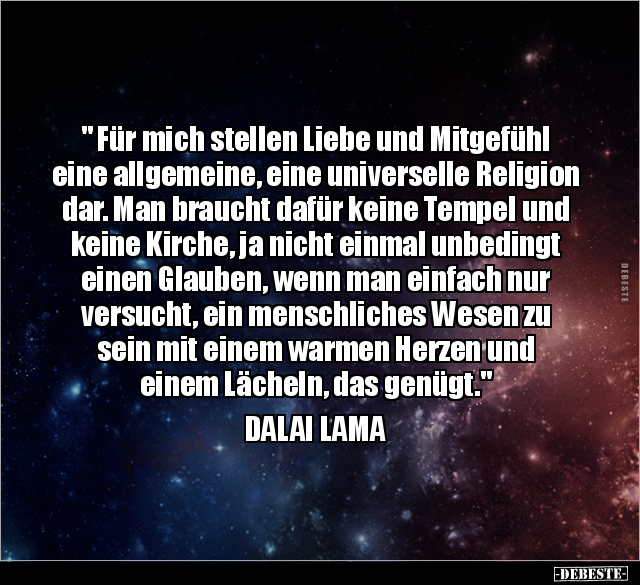 " Für mich stellen Liebe und Mitgefühl eine allgemeine, eine universelle Religion dar. Man braucht dafür keine Tempel und keine Kirche, ja nicht einmal unbedingt einen Glauben, wenn man einfach nur versucht, ein menschliches Wesen zu sein mit einem warmen Herzen und einem Lächeln, das genügt." DALAI LAMA