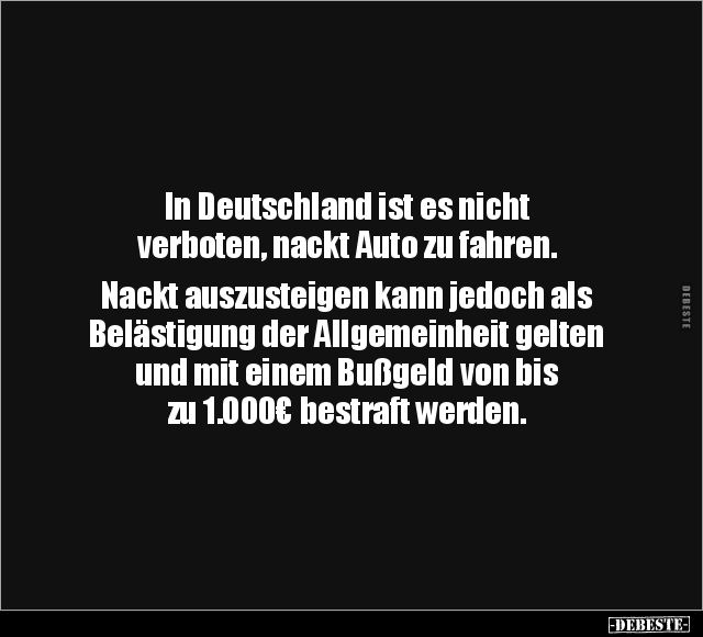 In Deutschland ist es nicht verboten, nackt Auto zu fahren. Nackt auszusteigen kann jedoch als Belästigung der Allgemeinheit gelten und mit einem Bußgeld von bis zu 1.000€ bestraft werden.