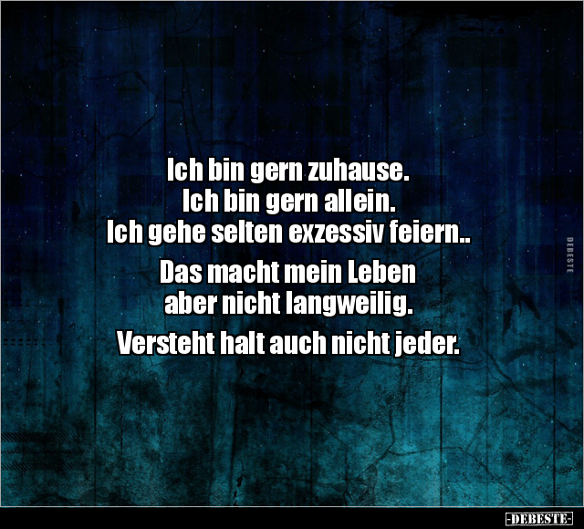 Ich bin gern zuhause. Ich bin gern allein. Ich gehe selten exzessiv feiern.. Das macht mein Leben aber nicht langweilig. Versteht halt auch nicht jeder.