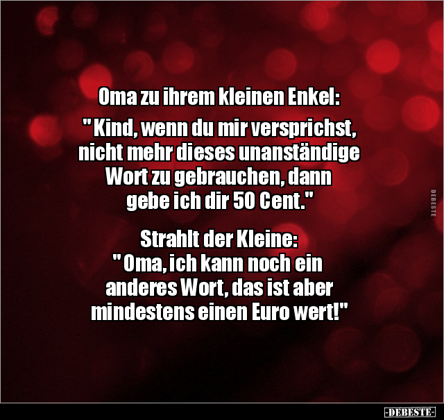 Oma zu ihrem kleinen Enkel: " Kind, wenn du mir versprichst, nicht mehr dieses unanständige Wort zu gebrauchen, dann gebe ich dir 50 Cent." Strahlt der Kleine: " Oma, ich kann noch ein anderes Wort, das ist aber mindestens einen Euro wert!"