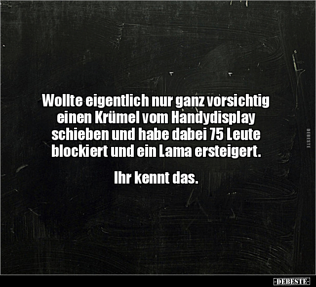Wollte eigentlich nur ganz vorsichtig einen Krümel vom Handydisplay schieben und habe dabei 75 Leute blockiert und ein Lama ersteigert. Ihr kennt das.