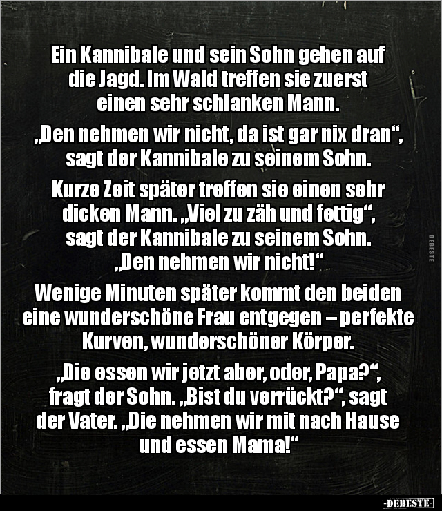 Ein Kannibale und sein Sohn gehen auf die Jagd. Im Wald treffen sie zuerst einen sehr schlanken Mann. „Den nehmen wir nicht, da ist gar nix dran“, sagt der Kannibale zu seinem Sohn. Kurze Zeit später treffen sie einen sehr dicken Mann. „Viel zu zäh und fettig“, sagt der Kannibale zu seinem Sohn. „Den nehmen wir nicht!“ Wenige Minuten später kommt den beiden eine wunderschöne Frau entgegen – perfekte Kurven, wunderschöner Körper. „Die essen wir jetzt aber, oder, Papa?“, fragt der Sohn. „Bist du verrückt?“, sagt der Vater. „Die nehmen wir mit nach Hause und essen Mama!“