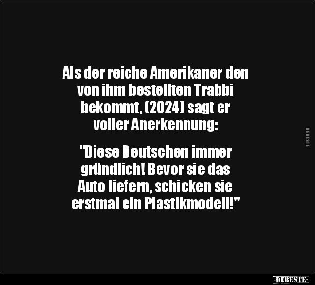 Als der reiche Amerikaner den von ihm bestellten Trabbi bekommt, (2024) sagt er voller Anerkennung: "Diese Deutschen immer gründlich! Bevor sie das Auto liefern, schicken sie erstmal ein Plastikmodell!"