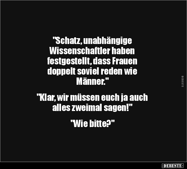 "Schatz, unabhängige Wissenschaftler haben festgestellt, dass Frauen doppelt soviel reden wie Männer." "Klar, wir müssen euch ja auch alles zweimal sagen!" "Wie bitte?"