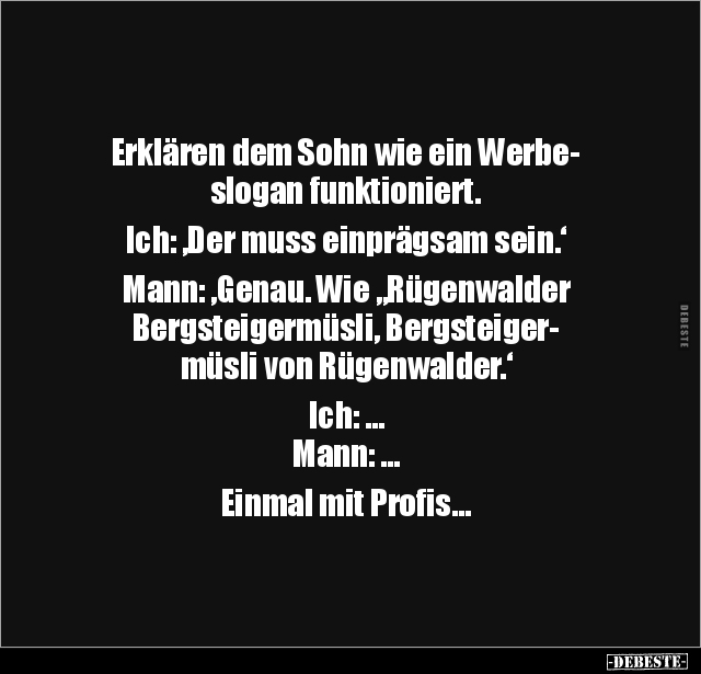 Erklären dem Sohn wie ein Werbe- slogan funktioniert. Ich: ,Der muss einprägsam sein.‘ Mann: ,Genau. Wie „Rügenwalder Bergsteigermüsli, Bergsteiger- müsli von Rügenwalder.‘ Ich: … Mann: … Einmal mit Profis…