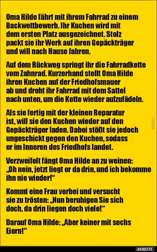 Oma Hilde fährt mit ihrem Fahrrad zu einem Backwettbewerb. Ihr Kuchen wird mit dem ersten Platz ausgezeichnet. Stolz packt sie ihr Werk auf ihren Gepäckträger und will nach Hause fahren. Auf dem Rückweg springt ihr die Fahrradkette vom Zahnrad. Kurzerhand stellt Oma Hilde ihren Kuchen auf der Friedhofsmauer ab und dreht ihr Fahrrad mit dem Sattel nach unten, um die Kette wieder aufzufädeln. Als sie fertig mit der kleinen Reparatur ist, will sie den Kuchen wieder auf den Gepäckträger laden. Dabei stößt sie jedoch ungeschickt gegen den Kuchen, sodass er im Inneren des Friedhofs landet. Verzweifelt fängt Oma Hilde an zu weinen: „Oh nein, jetzt liegt er da drin, und ich bekomme ihn nie wieder!“ Kommt eine Frau vorbei und versucht sie zu trösten: „Nun beruhigen Sie sich doch, da drin liegen doch viele!“ Darauf Oma Hilde: „Aber keiner mit sechs Eiern!“
