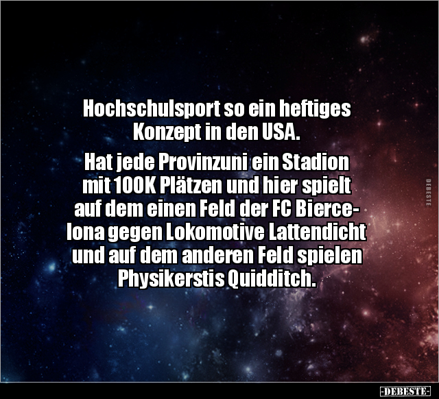 Hochschulsport so ein heftiges Konzept in den USA. Hat jede Provinzuni ein Stadion mit 100K Plätzen und hier spielt auf dem einen Feld der FC Bierce- lona gegen Lokomotive Lattendicht und auf dem anderen Feld spielen Physikerstis Quidditch.
