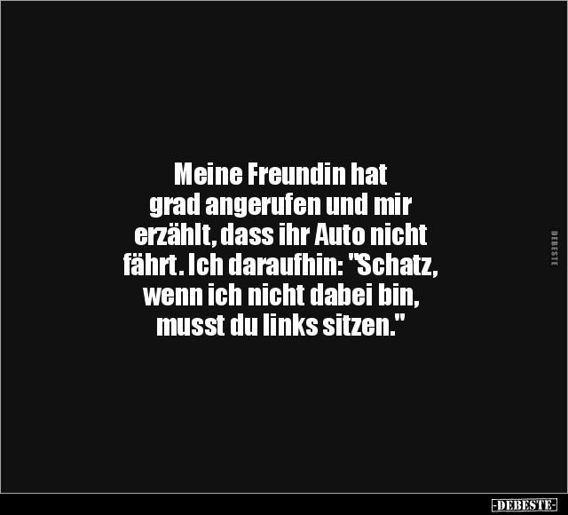 Meine Freundin hat grad angerufen und mir erzählt, dass ihr Auto nicht fährt. Ich daraufhin: "Schatz, wenn ich nicht dabei bin, musst du links sitzen."