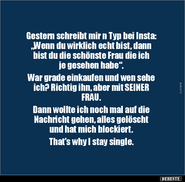 Gestern schreibt mir n Typ bei Insta: „Wenn du wirklich echt bist, dann bist du die schönste Frau die ich je gesehen habe“. War grade einkaufen und wen sehe ich? Richtig ihn, aber mit SEINER FRAU. Dann wollte ich noch mal auf die Nachricht gehen, alles gelöscht und hat mich blockiert. That’s why I stay single.