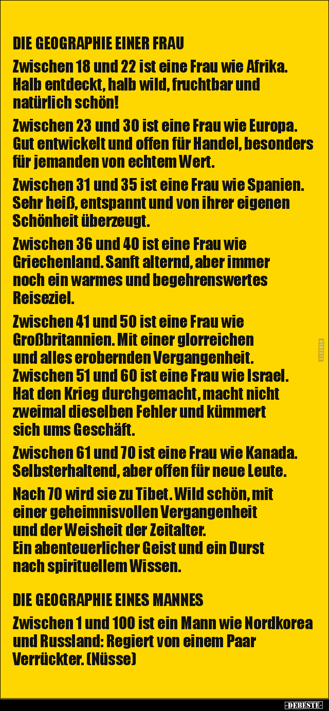 DIE GEOGRAPHIE EINER FRAU Zwischen 18 und 22 ist eine Frau wie Afrika. Halb entdeckt, halb wild, fruchtbar und natürlich schön! Zwischen 23 und 30 ist eine Frau wie Europa. Gut entwickelt und offen für Handel, besonders für jemanden von echtem Wert. Zwischen 31 und 35 ist eine Frau wie Spanien. Sehr heiß, entspannt und von ihrer eigenen Schönheit überzeugt. Zwischen 36 und 40 ist eine Frau wie Griechenland. Sanft alternd, aber immer noch ein warmes und begehrenswertes Reiseziel. Zwischen 41 und 50 ist eine Frau wie Großbritannien. Mit einer glorreichen und alles erobernden Vergangenheit. Zwischen 51 und 60 ist eine Frau wie Israel. Hat den Krieg durchgemacht, macht nicht zweimal dieselben Fehler und kümmert sich ums Geschäft. Zwischen 61 und 70 ist eine Frau wie Kanada. Selbsterhaltend, aber offen für neue Leute. Nach 70 wird sie zu Tibet. Wild schön, mit einer geheimnisvollen Vergangenheit und der Weisheit der Zeitalter. Ein abenteuerlicher Geist und ein Durst nach spirituellem Wissen. DIE GEOGRAPHIE EINES MANNES Zwischen 1 und 100 ist ein Mann wie Nordkorea und Russland: Regiert von einem Paar Verrückter. (Nüsse)