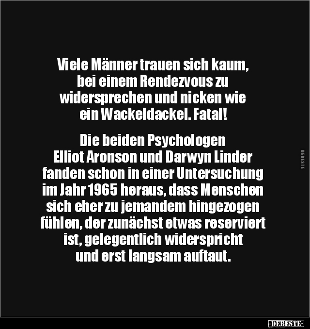 Viele Männer trauen sich kaum, bei einem Rendezvous zu widersprechen und nicken wie ein Wackeldackel. Fatal! Die beiden Psychologen Elliot Aronson und Darwyn Linder fanden schon in einer Untersuchung im Jahr 1965 heraus, dass Menschen sich eher zu jemandem hingezogen fühlen, der zunächst etwas reserviert ist, gelegentlich widerspricht und erst langsam auftaut.