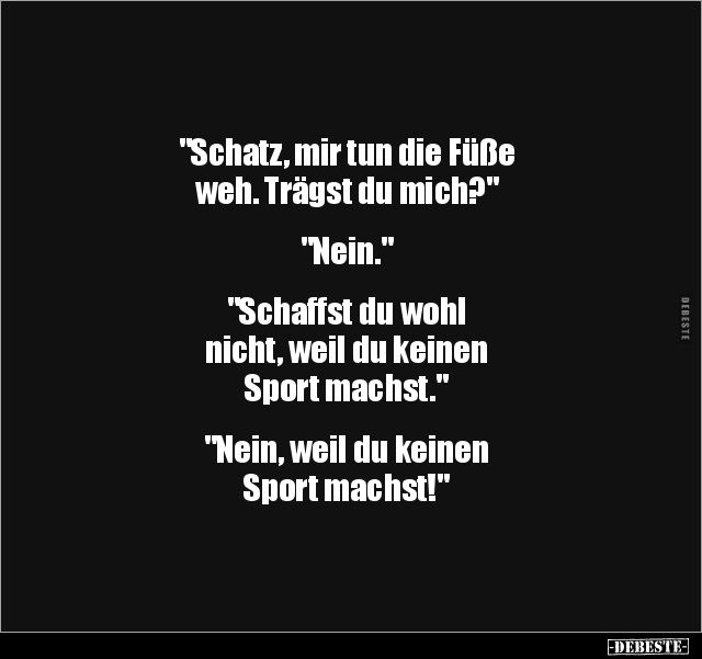 "Schatz, mir tun die Füße weh. Trägst du mich?" "Nein." "Schaffst du wohl nicht, weil du keinen Sport machst." "Nein, weil du keinen Sport machst!"