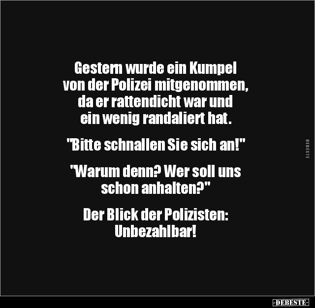 Gestern wurde ein Kumpel von der Polizei mitgenommen, da er rattendicht war und ein wenig randaliert hat. "Bitte schnallen Sie sich an!" "Warum denn? Wer soll uns schon anhalten?" Der Blick der Polizisten: Unbezahlbar!