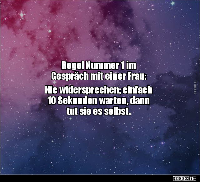 Regel Nummer 1 im Gespräch mit einer Frau: Nie widersprechen; einfach 10 Sekunden warten, dann tut sie es selbst.