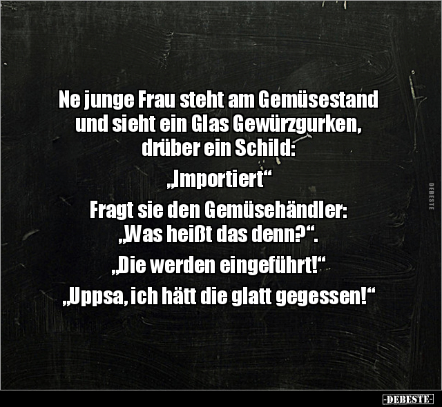 Ne junge Frau steht am Gemüsestand und sieht ein Glas Gewürzgurken, drüber ein Schild: „Importiert“ Fragt sie den Gemüsehändler: „Was heißt das denn?“. „Die werden eingeführt!“ „Uppsa, ich hätt die glatt gegessen!“