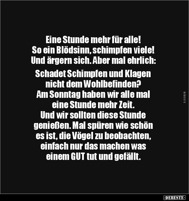 Eine Stunde mehr für alle! So ein Blödsinn, schimpfen viele! Und ärgern sich. Aber mal ehrlich: Schadet Schimpfen und Klagen nicht dem Wohlbefinden? Am Sonntag haben wir alle mal eine Stunde mehr Zeit. Und wir sollten diese Stunde genießen. Mal spüren wie schön es ist, die Vögel zu beobachten, einfach nur das machen was einem GUT tut und gefällt.
