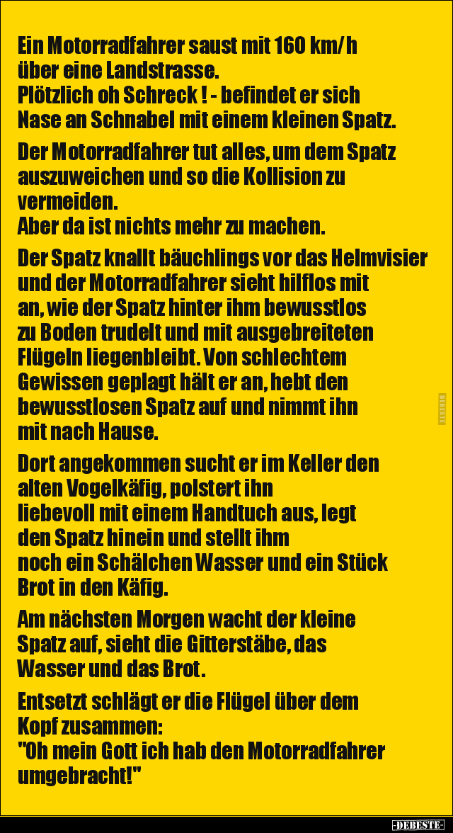 Ein Motorradfahrer saust mit 160 km/h über eine Landstrasse. Plötzlich oh Schreck ! - befindet er sich Nase an Schnabel mit einem kleinen Spatz. Der Motorradfahrer tut alles, um dem Spatz auszuweichen und so die Kollision zu vermeiden. Aber da ist nichts mehr zu machen. Der Spatz knallt bäuchlings vor das Helmvisier und der Motorradfahrer sieht hilflos mit an, wie der Spatz hinter ihm bewusstlos zu Boden trudelt und mit ausgebreiteten Flügeln liegenbleibt. Von schlechtem Gewissen geplagt hält er an, hebt den bewusstlosen Spatz auf und nimmt ihn mit nach Hause. Dort angekommen sucht er im Keller den alten Vogelkäfig, polstert ihn liebevoll mit einem Handtuch aus, legt den Spatz hinein und stellt ihm noch ein Schälchen Wasser und ein Stück Brot in den Käfig. Am nächsten Morgen wacht der kleine Spatz auf, sieht die Gitterstäbe, das Wasser und das Brot. Entsetzt schlägt er die Flügel über dem Kopf zusammen: "Oh mein Gott ich hab den Motorradfahrer umgebracht!"