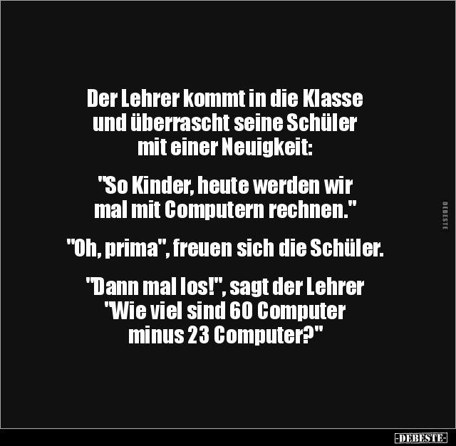 Der Lehrer kommt in die Klasse und überrascht seine Schüler mit einer Neuigkeit: "So Kinder, heute werden wir mal mit Computern rechnen." "Oh, prima", freuen sich die Schüler. "Dann mal los!", sagt der Lehrer "Wie viel sind 60 Computer minus 23 Computer?"