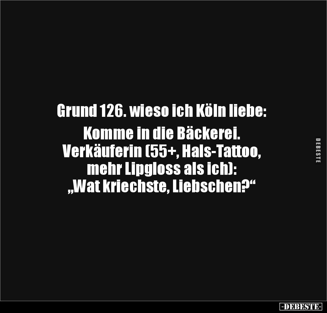 Grund 126. wieso ich Köln liebe: Komme in die Bäckerei. Verkäuferin (55+, Hals-Tattoo, mehr Lipgloss als ich): „Wat kriechste, Liebschen?“