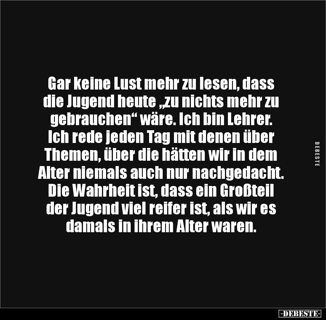 Gar keine Lust mehr zu lesen, dass die Jugend heute „zu nichts mehr zu gebrauchen“ wäre. Ich bin Lehrer. Ich rede jeden Tag mit denen über Themen, über die hätten wir in dem Alter niemals auch nur nachgedacht. Die Wahrheit ist, dass ein Großteil der Jugend viel reifer ist, als wir es damals in ihrem Alter waren.