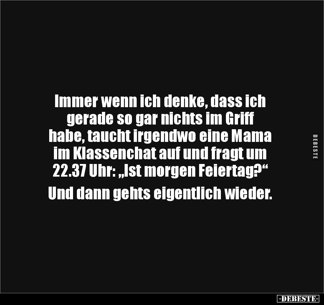 Immer wenn ich denke, dass ich gerade so gar nichts im Griff habe, taucht irgendwo eine Mama im Klassenchat auf und fragt um 22.37 Uhr: „Ist morgen Feiertag?“ Und dann gehts eigentlich wieder.