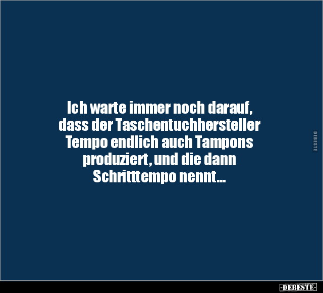 Ich warte immer noch darauf, dass der Taschentuchhersteller Tempo endlich auch Tampons produziert, und die dann Schritttempo nennt...