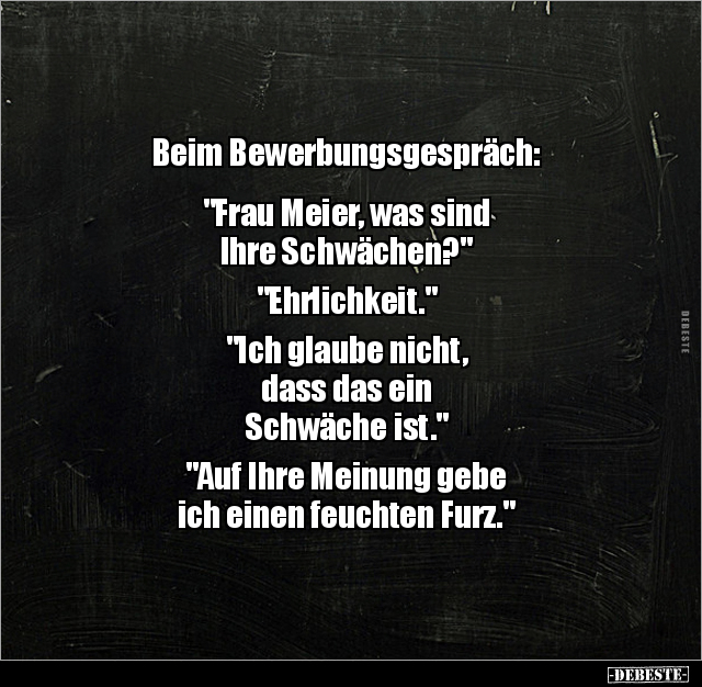 Beim Bewerbungsgespräch: "Frau Meier, was sind Ihre Schwächen?" "Ehrlichkeit." "Ich glaube nicht, dass das ein Schwäche ist." "Auf Ihre Meinung gebe ich einen feuchten Furz."
