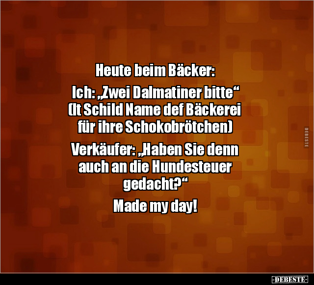 Heute beim Bäcker: Ich: „Zwei Dalmatiner bitte“ (lt Schild Name def Bäckerei für ihre Schokobrötchen) Verkäufer: „Haben Sie denn auch an die Hundesteuer gedacht?“ Made my day!