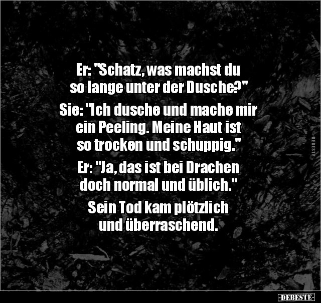 Er: "Schatz, was machst du so lange unter der Dusche?" Sie: "Ich dusche und mache mir ein Peeling. Meine Haut ist so trocken und schuppig." Er: "Ja, das ist bei Drachen doch normal und üblich." Sein Tod kam plötzlich und überraschend.