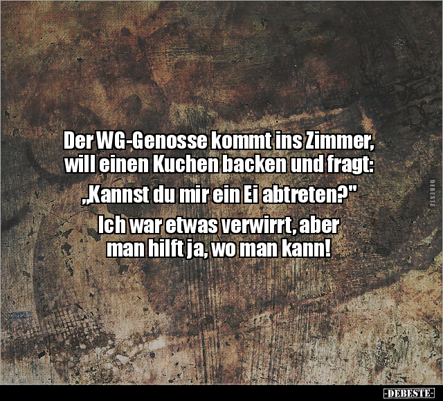 Der WG-Genosse kommt ins Zimmer, will einen Kuchen backen und fragt: „Kannst du mir ein Ei abtreten?" Ich war etwas verwirrt, aber man hilft ja, wo man kann!