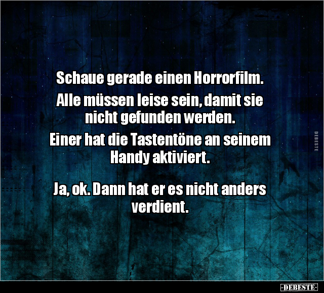 Schaue gerade einen Horrorfilm. Alle müssen leise sein, damit sie nicht gefunden werden. Einer hat die Tastentöne an seinem Handy aktiviert. Ja, ok. Dann hat er es nicht anders verdient.