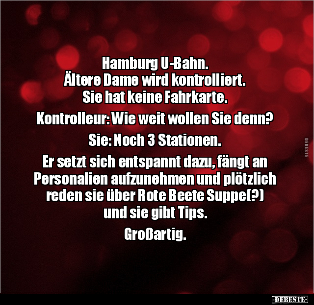Hamburg U-Bahn. Ältere Dame wird kontrolliert. Sie hat keine Fahrkarte. Kontrolleur: Wie weit wollen Sie denn? Sie: Noch 3 Stationen. Er setzt sich entspannt dazu, fängt an Personalien aufzunehmen und plötzlich reden sie über Rote Beete Suppe(?) und sie gibt Tips. Großartig.