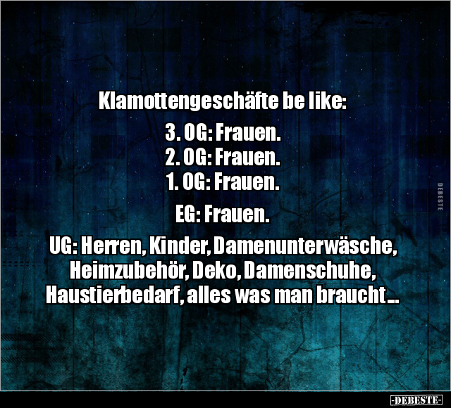 Klamottengeschäfte be like: 3. OG: Frauen. 2. OG: Frauen. 1. OG: Frauen. EG: Frauen. UG: Herren, Kinder, Damenunterwäsche, Heimzubehör, Deko, Damenschuhe, Haustierbedarf, alles was man braucht...