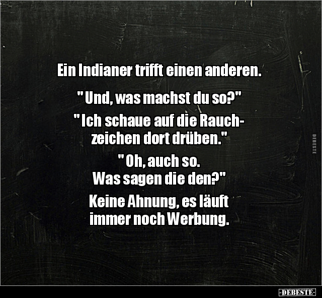 Ein Indianer trifft einen anderen. " Und, was machst du so?" " Ich schaue auf die Rauch- zeichen dort drüben." " Oh, auch so. Was sagen die den?" Keine Ahnung, es läuft immer noch Werbung.