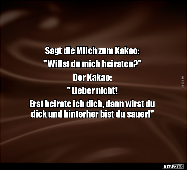 Sagt die Milch zum Kakao: " Willst du mich heiraten?" Der Kakao: " Lieber nicht! Erst heirate ich dich, dann wirst du dick und hinterher bist du sauer!"