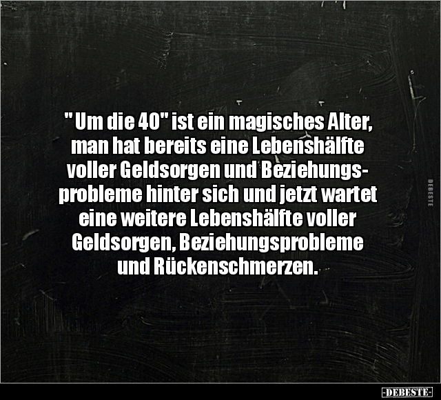 " Um die 40" ist ein magisches Alter, man hat bereits eine Lebenshälfte voller Geldsorgen und Beziehungs- probleme hinter sich und jetzt wartet eine weitere Lebenshälfte voller Geldsorgen, Beziehungsprobleme und Rückenschmerzen.
