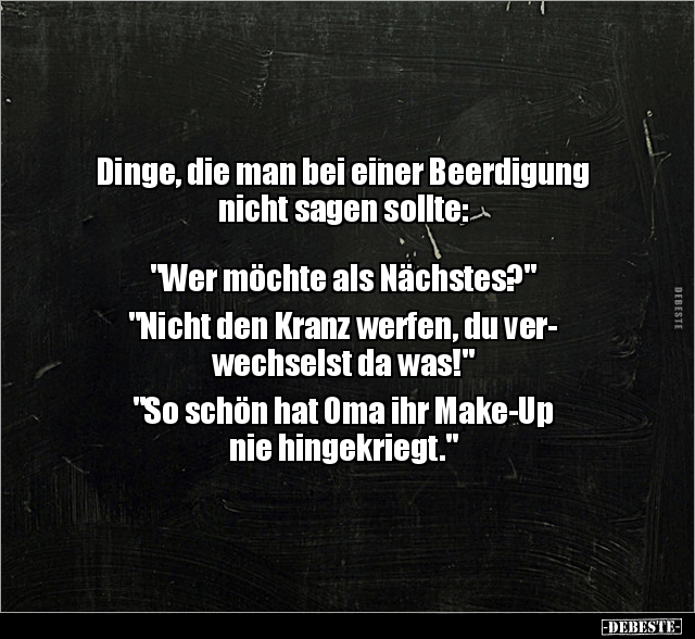 Dinge, die man bei einer Beerdigung nicht sagen sollte: "Wer möchte als Nächstes?" "Nicht den Kranz werfen, du ver- wechselst da was!" "So schön hat Oma ihr Make-Up nie hingekriegt."