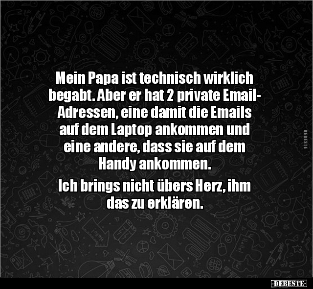 Mein Papa ist technisch wirklich begabt. Aber er hat 2 private Email- Adressen, eine damit die Emails auf dem Laptop ankommen und eine andere, dass sie auf dem Handy ankommen. Ich brings nicht übers Herz, ihm das zu erklären.