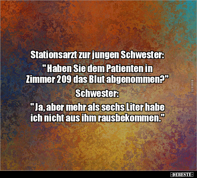 Stationsarzt zur jungen Schwester: " Haben Sie dem Patienten in Zimmer 209 das Blut abgenommen?" Schwester: " Ja, aber mehr als sechs Liter habe ich nicht aus ihm rausbekommen."