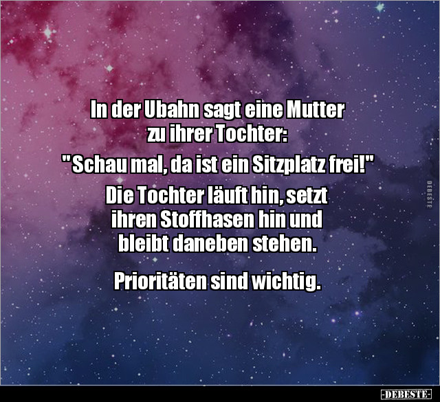 In der Ubahn sagt eine Mutter zu ihrer Tochter: " Schau mal, da ist ein Sitzplatz frei!" Die Tochter läuft hin, setzt ihren Stoffhasen hin und bleibt daneben stehen. Prioritäten sind wichtig.