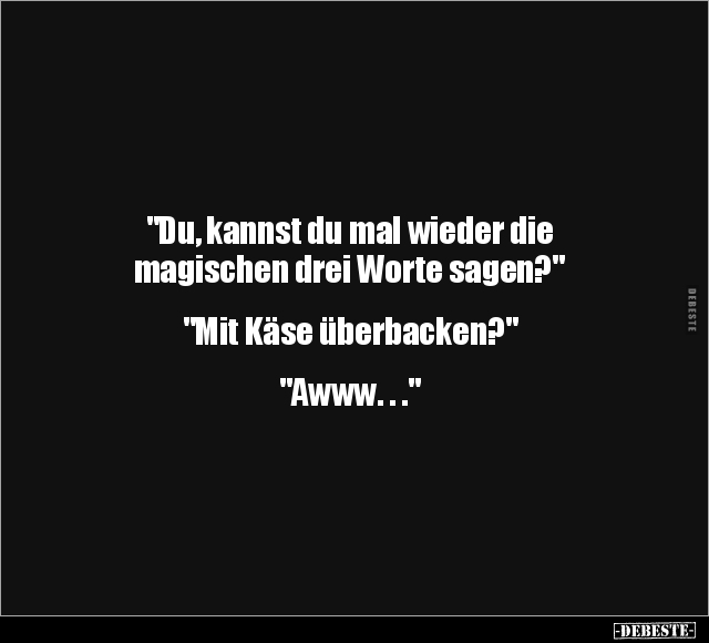 "Du, kannst du mal wieder die magischen drei Worte sagen?" "Mit Käse überbacken?" "Awww. . ."